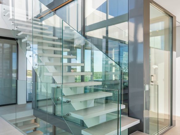 The three bedrooms are located on different levels, offering complete privacy and breathtaking views from each room. The master suite is located on the top level with an en-suite bathroom and dressing area. The two other bedrooms are located on the lower levels, each with their own en-suite bathroom.