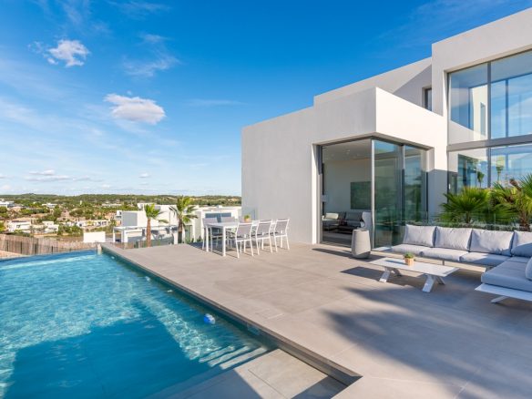 The Bright Patio detached villa at Las Colinas Golf Resort is a breathtaking masterpiece. The villa boasts three levels, each offering stunning views of the surrounding landscape, with a striking modern design that is truly spectacular.