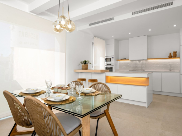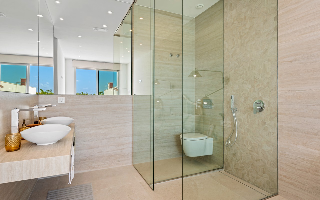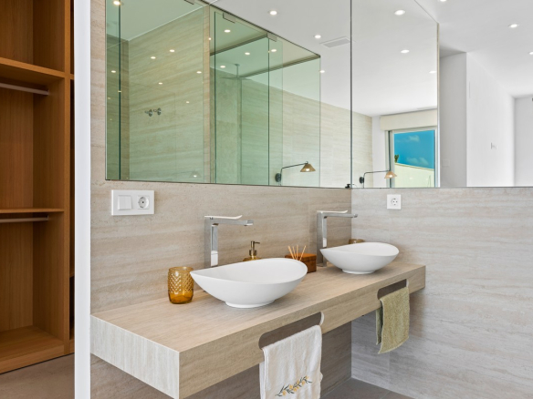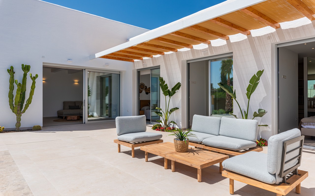 These elegant homes showcase a contemporary Ibizan design with clean lines and bright white façades. The architecture blends modern comfort with Mediterranean character. As a result, each villa feels both stylish and welcoming.